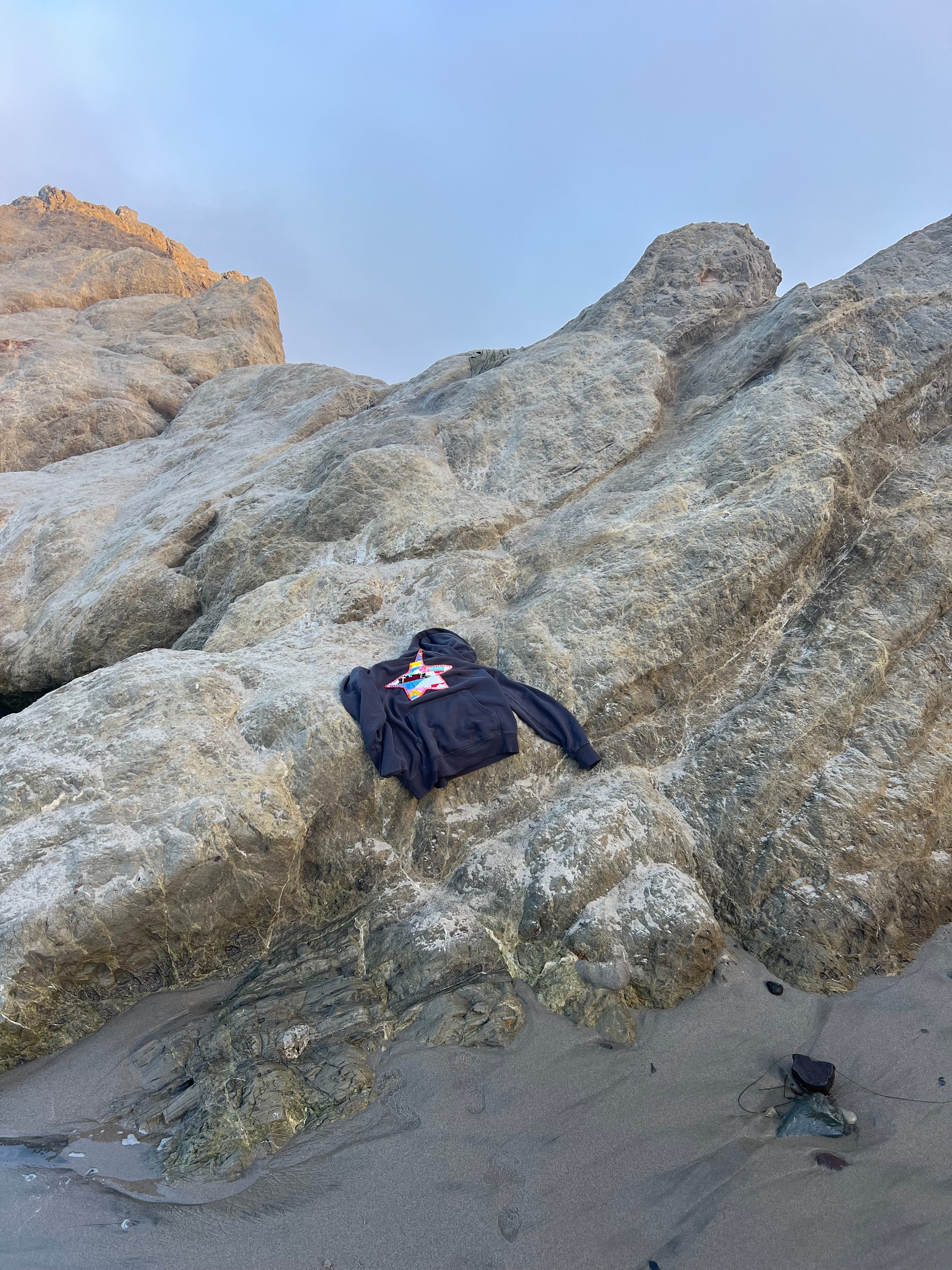 Star on the front of the hoodie is custom made out of a quilt blanket + stitched in Los Angeles, CA