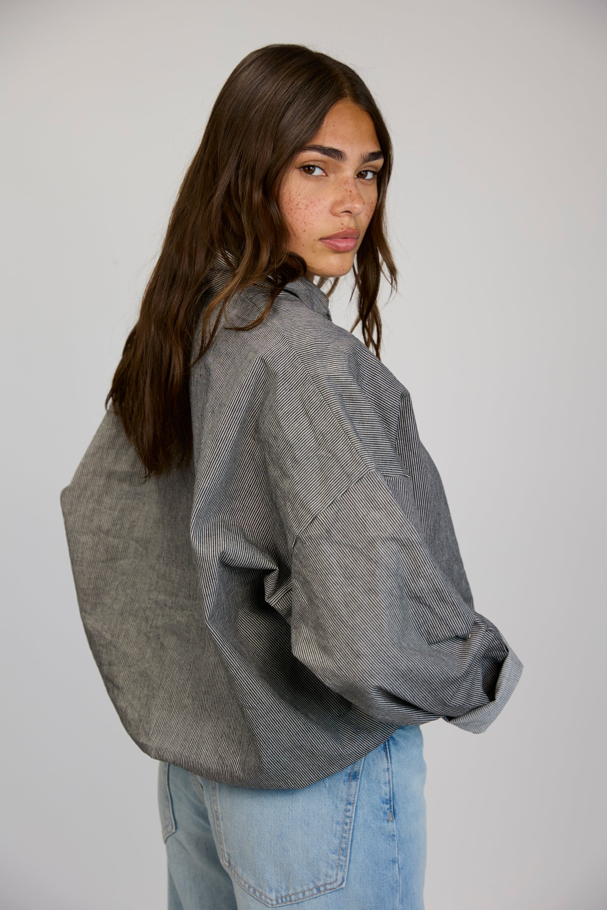 Unique fit with a boxy shape, cinched bottom, and thick collar giving the design a comfortable yet elevated look.